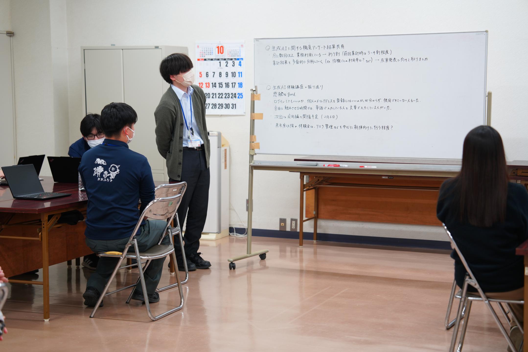 第1回会議のグループワークでは、3つの班がそれぞれ「シティプロモーション」「交通」「生成AI」をテーマとして研究に取り組むことが決まり、着手しました。初回は、メンバーの顔合わせと、今後の進め方や現状認識などを話し合い、最後に、各班の取組について情報共有するため、まとめ発表を行いました。