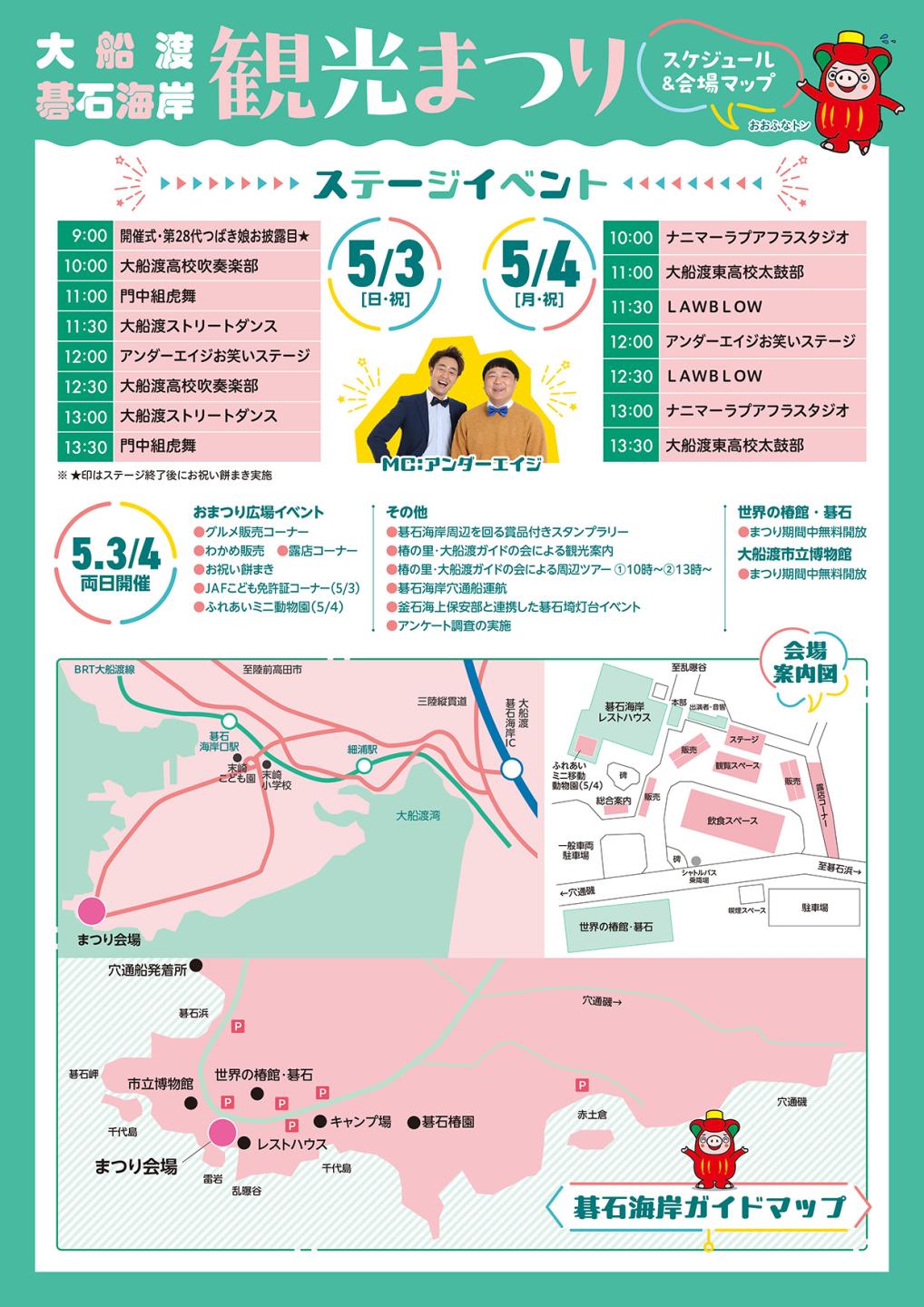 会場周辺の景観を生かし、三陸海岸の代表的な景勝地である碁石海岸の美しさやグルメ、郷土芸能をはじめとするステージイベントなど、お子さんから大人の方までお楽しみいただけますので、お誘い合わせの上、是非御来場ください。