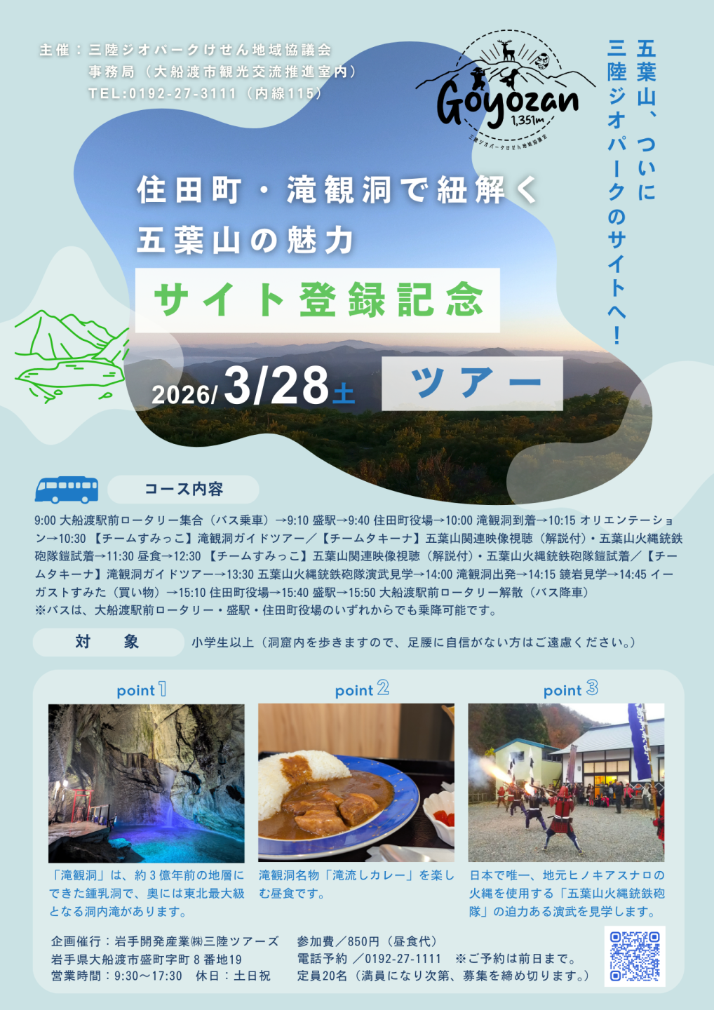 本ツアーでは、五葉山を起点に、住田町気仙川へとつながる大地と水の物語をたどりながら、山・川・地下世界が一体となったジオストーリーを「滝観洞」で体感していただきます。